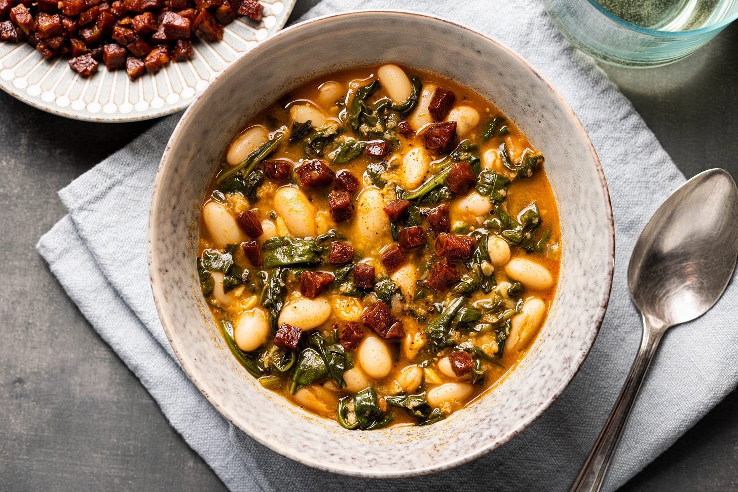 Inspired by Goan and Iberian flavors, this is the kind of soup that smells like you’ve been cooking all day, even though you absolutely have not. Smoky chorizo releases fat-soluble flavor compounds into the pot, creamy white beans thicken the broth naturally with their starches, and a final hit of greens and acid wakes everything back up so it doesn’t taste like winter fatigue in a bowl.